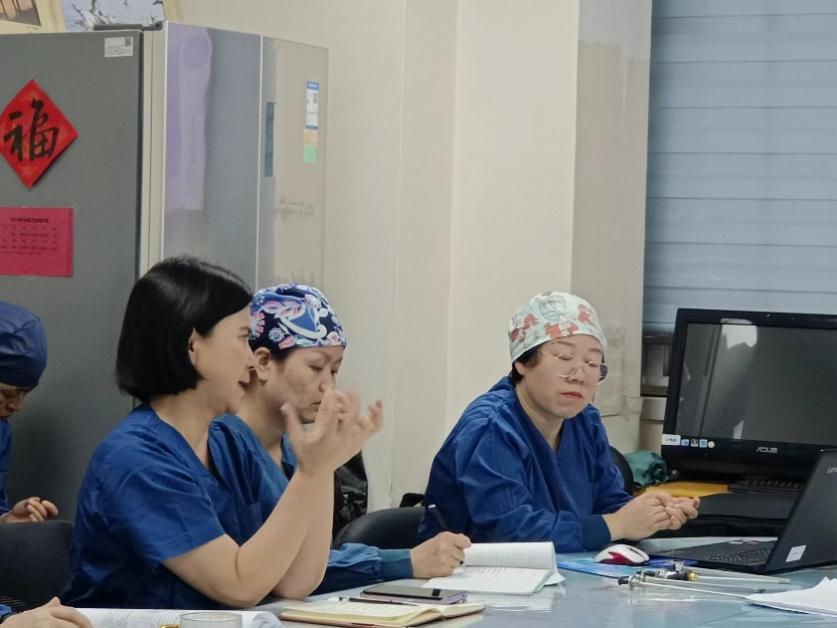在自由发言环节,去污区组长王静、副组长王韵,检查包装区组长杨哲、副组长周雪萍、无菌物品管理及灭菌区组长张晶、器械管理兼职人员黄晓宇老师,分别结合自己的工作经验对泌尿外科专科器械处置中的难点及关注点进行了补充,对授课内容的完善及PPT制作提出建议。