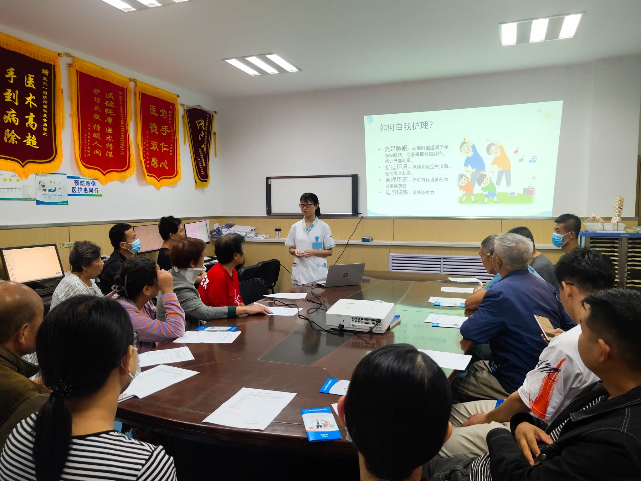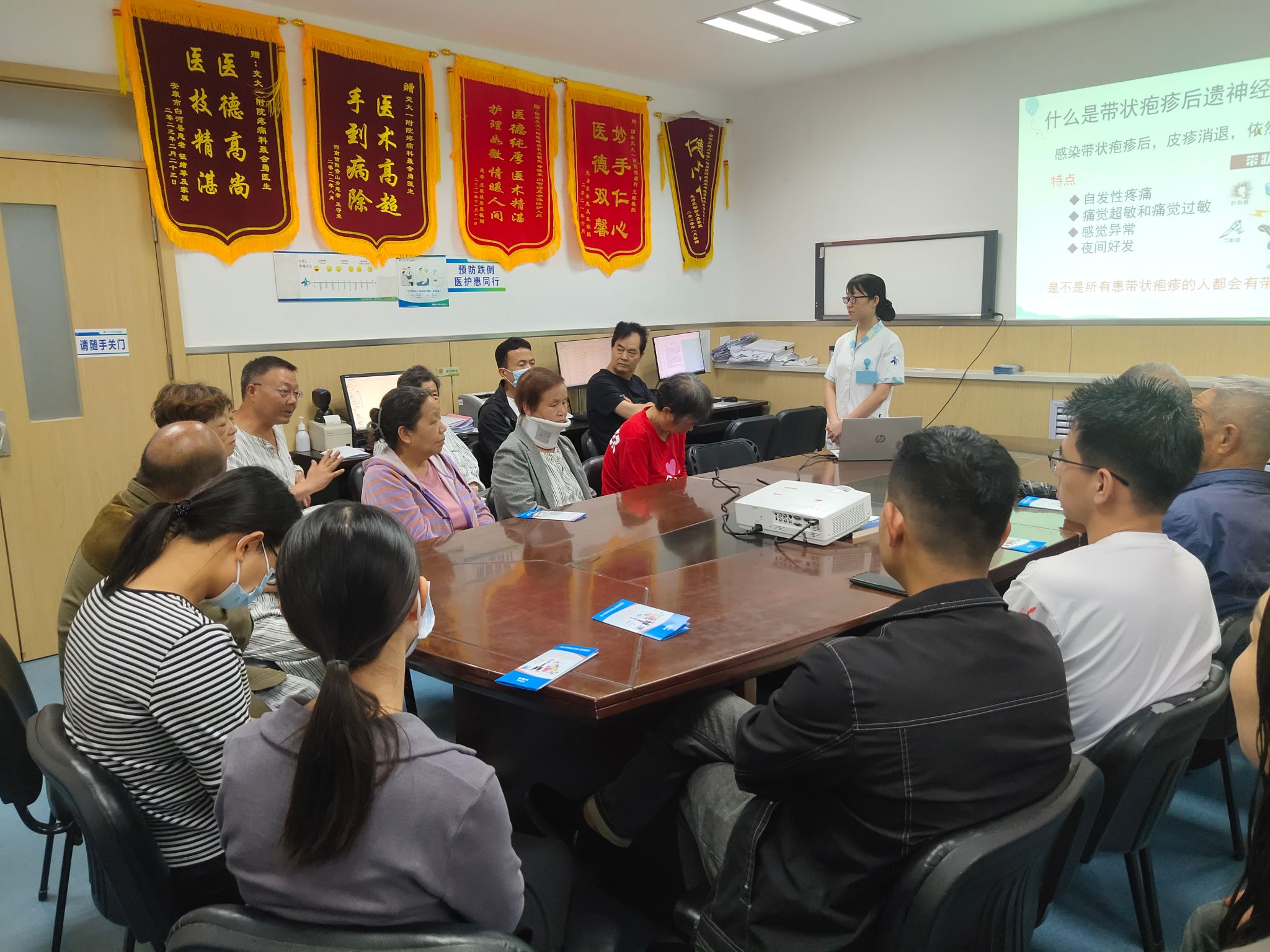 自新冠病毒感染以来,带状疱疹后遗神经痛的患者日益增多,9月19日下午15:30疼痛科护理单元积极响应科普号召,广泛动员,常态化开展 “为你解忧,还你无痛生活” 疼痛科普活动,此次活动的主题是“得了带状疱疹后遗神经痛,应该怎么办 ?”科室的患者及家属共计30余人参加此次活动,疼痛科护士刘霄莹通过多媒体互动、宣传彩页,情景模拟,护患沟通的方式进行疾病相关防治知识的讲解,内容丰富多彩,通俗易懂,并现场为各位患者及家属答疑解惑,最后,邀请了科室带状疱疹后遗神经痛射频治疗后的患者,现身说法,将疼痛治疗就诊体验、效果和病友们进行分享,增加了患者朋友对抗疾病的信心和勇气,使得大家正确认识此类疾病,同时规范诊治、科学治疗、科学预防,活动氛围活跃,患者反馈良好,很多患者表示会将学习到的内容宣传给亲戚、朋友,让他人也能远离带状疱疹带来的“疼痛”之苦,纷纷表示非常愿意参加此类科普宣传,非常有益。