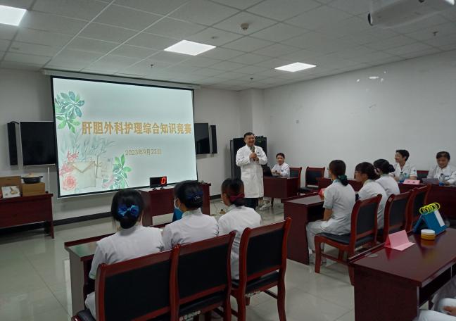 为了营造积极的学习氛围,提高大家的知识储备和业务能力,更好的为临床工作服务,肝胆外科五病区于9月22日中午,特举办“以赛促学强基础,以学促用砺精兵”护理综合知识竞赛,参与此次竞赛的嘉宾有:肝胆外科仵正主任,肝胆五病区沙焕臣主任,东院护理部刘颖主任,肝胆外科总护士长杨勤玲护士长,仲裁组由刘颖主任、杨勤玲护士长担任,记分员由董芳芳护士长担任。