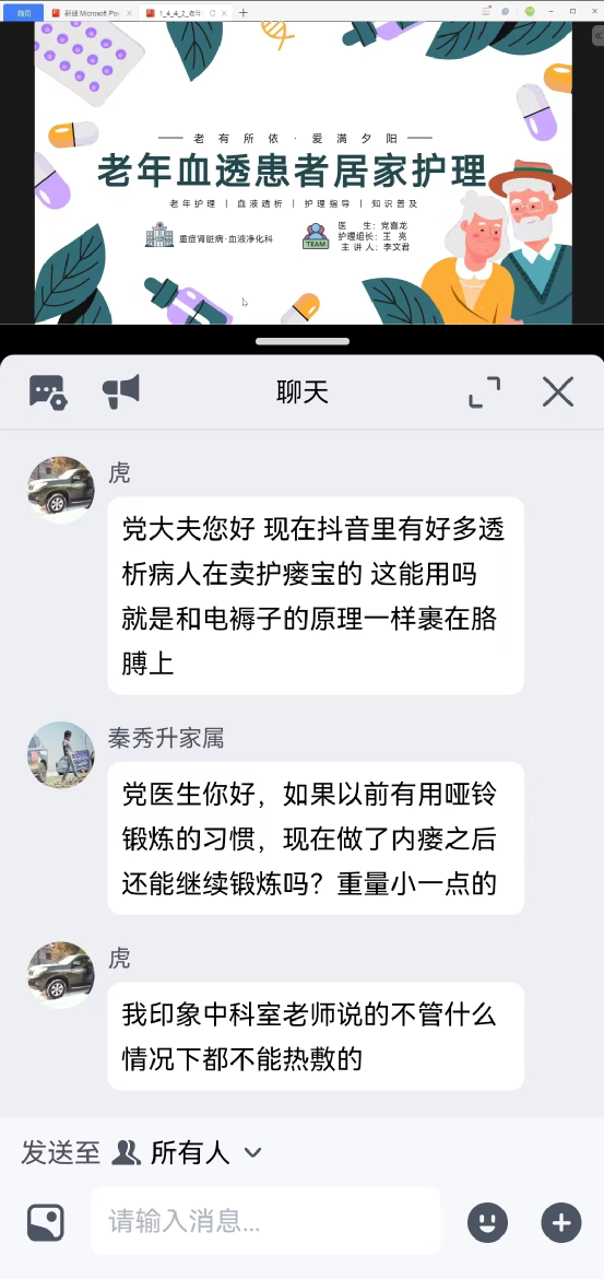 金秋九月,丹桂飘香。为了进一步加强肾病及血液净化知识宣教,减少尿毒症老年患者的透析并发症,更好的改善肾友们的治疗效果及生存质量,重症肾脏病·血液净化科党喜龙主治大夫和王亮主管护师医患一体化小组接过其它小组健康教育的接力棒,如期在东一楼血液净化科会议室线下和腾讯会议线上举办了健康教育讲座活动。
