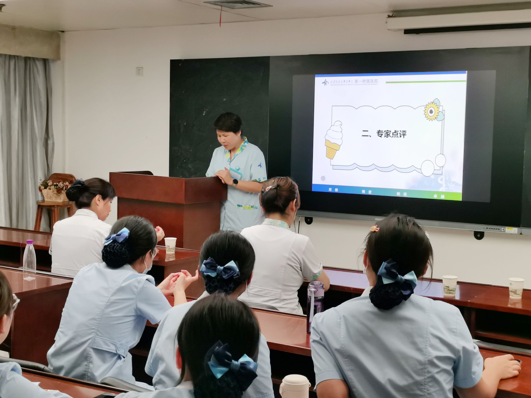 评委老师们对同学们的表现给予了充分的肯定,并指出要充分与临床疾病联系起来。要让同学们通过讲解,了解相关疾病知识,这才是小讲课的真正意义。服务是宗旨,需求是导向,努力学以致用,为患者提供优质服务。