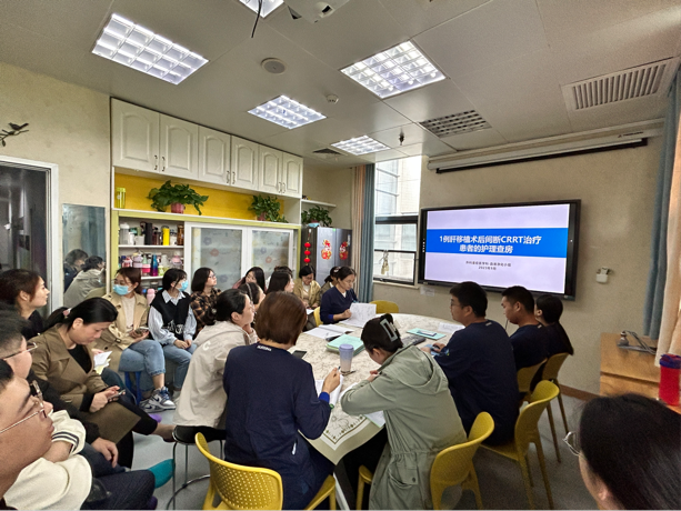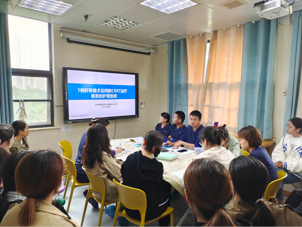 第二部分由金玉峰主管护理师、何栋主管护理师、宁飞莎护师为大家分享了一例肝移植术后间断CRRT治疗患者的护理查房。目前我科对于肝移植术后病人的护理以及CRRT的使用已经渐趋成熟,随着肝移植患者数量的增加,对护理人员的业务能力要求也随之增高。本次查房,由金玉峰主管护理师讲解了肝移植与CRRT的理论知识,分别讲解了肝移植术后急性肾损伤的定义、分级、相关危险因素以及肝移植术后AKI的预防及处理;还有CRRT的相关知识,让我们受益匪浅。何栋主管护理师带领大家回顾了患者的病程,从患者的既往史,入院诊断以及诊疗经过进行详细具体的汇报,根据病情提出护理问题以及相应的护理措施,最后做出护理评价;宁飞莎护理师最后进行了总结,就肝移植术后知识点以及CRRT护理讲解了对肝移长期血透患者如何做好管路护理。最后由申存毅护士长进行补充点评及总结,提出了今后患者护理的改进的措施和要求,为患者康复打下坚实基础。今天三位老师较为系统全面的分享了肝移植术后患者护理的重点与难点,以及CRRT管路的护理,相信通过这次的学习,与会的护理人员都能对肝移植的护理有所收获。