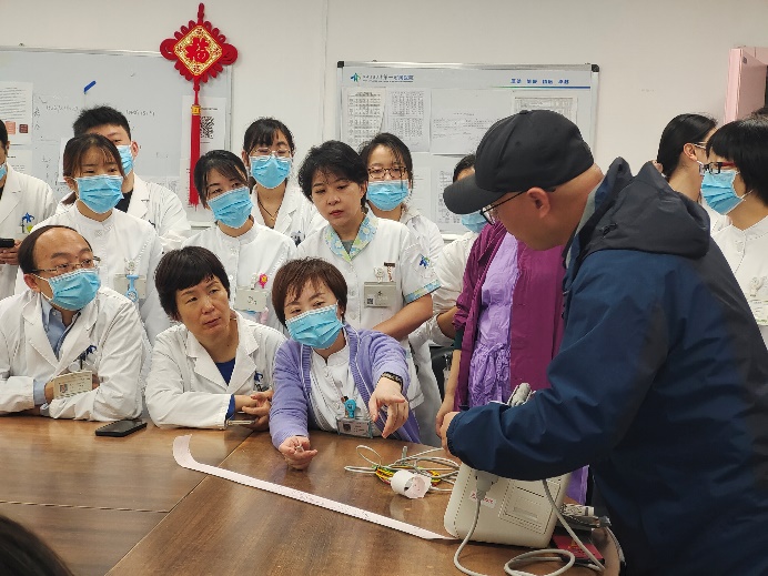 我国每年心源性猝死的总人数约为54.14万,心跳骤停的病人约80%为室颤,而发生室颤最有效的是电除颤,除颤每延迟1分钟,成功率将下降7%-10%,这也就体现了掌握除颤仪的必要性。除颤仪的原理是用高功率与短时限的电脉冲通过胸壁或直接通过心脏,在短时间内使全部心肌纤维全部除极,电活动暂时停止,中断折返通路,消除异位兴奋灶,使窦房结重新控制心律,恢复为正常的窦性心律。10月25日晨交班后,在胡经文护士长的组织下,外请的除颤仪工程师对全体医护人员进行“除颤仪使用”相关知识的培训,参与本次培训的有心内一病区所有医护人员、规培医生、规培护士等。