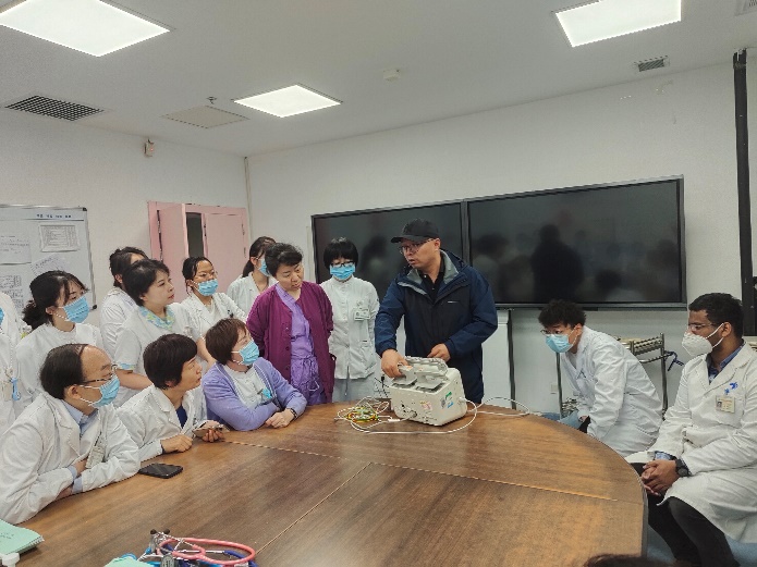 工程师主要从除颤仪的基本构成、主要适应症、操作流程、注意事项等四大部分进行讲解,其中最主要的是操作流程,做到人人应知应会,其次就是除颤仪的电池充电保养等注意事项,每周规定时间按时充电,携带除颤仪外出检查安返病房后及时充电。通过本次培训,让大家再次温习除颤仪相关知识,急救状态下能沉稳面对,在黄金时间内能挽救更多人的生命。最后胡经文护士长对本次知识培训进行总结,大家积极对本次所学内容进行探讨。