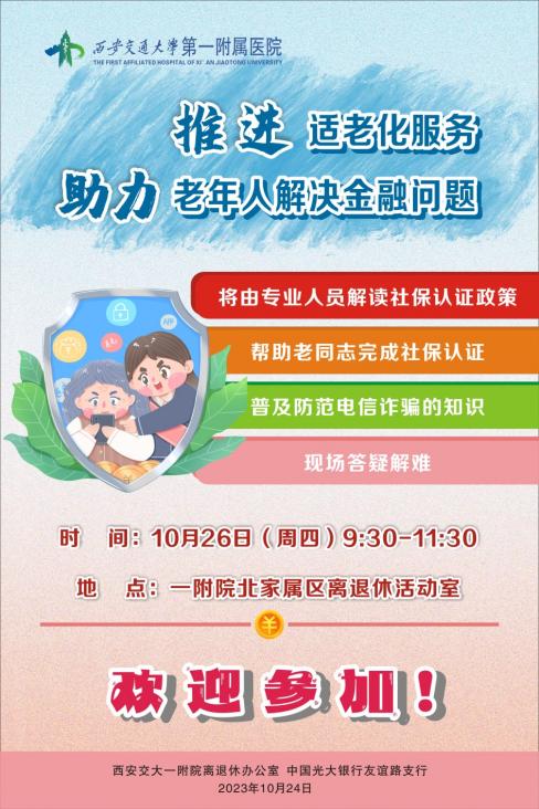 10月26日上午,由我院离退休办公室/党支部、中国光大银行友谊路支行共同组织举行了专题讲座,推进适老化服务,助力老年人解决金融问题。