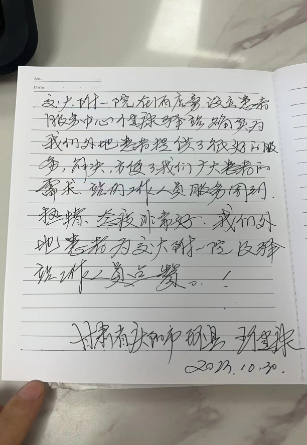 第一次来我院就诊的甘肃患者对患者服务中心健康驿站留下了深刻印象,写下了这样的就医体验“交大一附院设立患者服务中心健康驿站确实为我们外地患者提供了很好的服务,解决、方便了我们广大患者的需求,站内工作人员服务周到、热情,态度非常好,我们外地患者为交大一附院及驿站的工作人员点赞!”患者的鼓励是我们工作的最大动力,患者服务中心不断细化服务流程、优化服务环节,提升患者就医体验,充分发挥好团队在医患及科室间的“桥梁作用”。