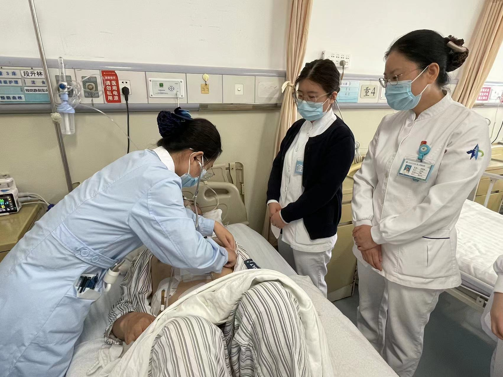 以往晨交接班环节由交班者和接班者在床旁进行口头交接,在孙亚利护士长的带领下,晨交班环节改为以学生为主体、以问题为导向的方式,由当日负责重病室工作的护理实习生向大家介绍患者病情,进行床旁查体,包括肺部听诊、腹部查体、肠鸣音听诊等环节,并针对性地提出今日护理计划及重点。孙亚利护士长指出,教学工作应当以实际患者为主,避免填鸭式死板教学,应充分调动实习生们的积极性,学习理论知识的同时逐步落实实践操作,培养临床思维模式,为护理实习生们创造一个优质有效的实习氛围。