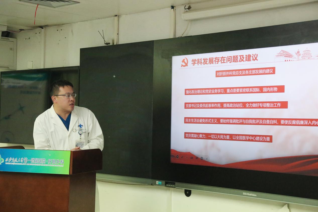 首先,肝胆外科党总支书记王铮对前来参加调研工作的院领导表示欢迎,随后介绍了目前肝胆外科发展的现状与支部建设的工作重点。肝胆外科党总支按照肝胆外科亚专业建制下属七个党支部,目前已成为西北地区规模最大,亚专科划分最深彻的肝胆胰及肝移植外科。各支部及亚专业重点工作特色化鲜明,学科群布局合理,但还有一定提升空间。王铮同志代表科室就目前的很多专项整治工作及科室发展中存在的问题向院方做了汇报。