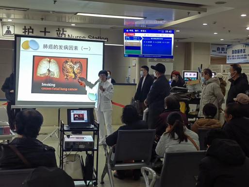 两位健康宣讲员分别从疾病的概述、发病原因、流行病学、临床表现、治疗方式及术后功能锻炼的方法等几个方面细致的为大家讲解了相关内容。并指出,近年来,随着吸烟、大气污染、厨房油烟等因素的影响,肺癌的发病率逐年升高,而目前治疗肺癌最有效的方式即为手术治疗,其次为化疗和放疗,然而不论是哪种手术方式,都会形成术后的残腔,如果呼吸功能锻炼不好,残腔将永久形成,进而导致肺不张、肺萎陷等各种并发症的产生,由此可见呼吸功能锻炼的重要性,随后,为了大家能更准确的掌握各种呼吸功能锻炼的方法,两位健康宣讲师结合PPT文字和图片进行了现场的指导和演示。