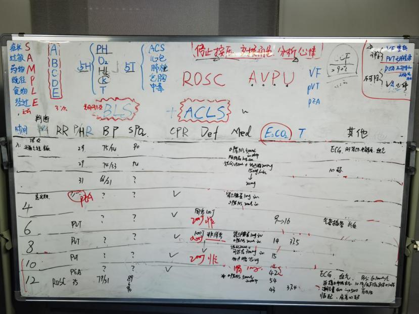 本次综合技能竞赛由心血管病院继续教育组老师策划组织,活动安排包括三部分:第一是赛前高级生命支持技能的系统培训;第二为专科理论考核,第三为医护联合的三站式操作技能比赛。赛前的高级生命支持培训让人眼前一亮,这与日常的基本生命支持明显不同更加注重培养医护人员的整体急救思维,而不只是单一的急救技能。培训导师急诊科高烨老师首先讲述了成人心脏骤停的抢救流程,然后现场提供了一个三度房室传导阻滞的晕厥病例,让医护三人团队现场模拟真实的抢救过程,另外一位老师在白板按时间为纵轴,生命体征、给予抢救的措施及其他为横轴,每2分钟记录一次。此过程中老师根据每组人员给予的不同抢救措施利用高级模拟监护系统出现不同的心率、血压、血氧,通过这些数据能够清晰判断选手给予的措施是否准确有效。模拟抢救结束后,技能中心柏宏亮主任带领大家复盘刚才的抢救过程,先让记录者确定记录内容是否准确,再讲述整个抢救过程,然后柏老师带领大家根据抢救时间分析措施是否得当。整个赛前培训让我对院内抢救流程有了更进一步的认识,让我明白了如何通过系统化且简单易懂的方式复盘抢救记录,从而应用在实际工作中。