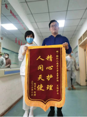 3月3日下午,一位患者家属走到护士站,拿出一面印着“人间天使,精心护理”的锦旗,专门来感谢主管护理师王芳。送锦旗的是31床陈爷爷的儿子,他一边双手递过锦旗,一边不住的感谢:“我父亲手术后多亏了你专业的护理和悉心的指导,才让他恢复的这么快,心情也好了很多。”