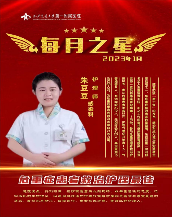 随着防疫“新十条”的发布,感染科成为救治危重症新冠患者的主要战场之一,急危重症新冠患者数量剧增,朱豆豆第一时间报名加入重症救治组,同事们相继感染新冠病毒,工作人员数量锐减,没有感染新冠病毒的豆豆老师,一直坚持在临床一线。2023年1月份,豆豆参与危重症患者救治护理18天,参与危重患者抢救15次,护理气管切开患者1人,气管插管8人,有创呼吸机10人,无创呼吸机25人,高流量湿化治疗30人次,为危重症患者的救治贡献自己的力量,因此被评为“危重症患者救治护理最佳”称号。