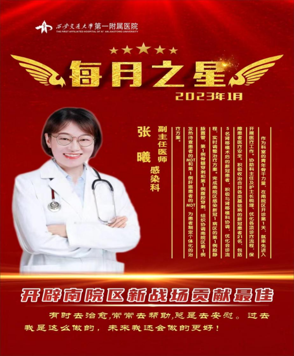 张曦作为科室的青年骨干力量,在南院区开诊第1天就率先进入南院区,协助科主任及护士长梳理、优化各项诊疗流程,克服种种困难,确保南院区顺利开诊。2023年1月份,他们组收治合并各类基础病的新冠患者21名,包括5名肾移植术后的新冠患者,率先完成南院区第1例股静脉置管,第1例骨髓穿刺和第1例腹腔穿刺,并组织协调南院区第1例发热待查患者的MDT和第1例肝癌患者的MDT,因此获得“开辟南院区新战场贡献最佳”称号。
