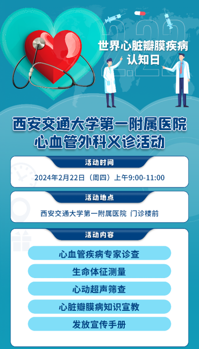 2024年2月22日,西安交通大学第一附属医院心血管外科成功举办“关注瓣膜病,守护‘心’健康”义诊活动。旨在提高公众对心脏瓣膜疾病的认识和关注,帮助更多人了解心脏瓣膜病的危害性,及早发现并治疗这一健康隐患。