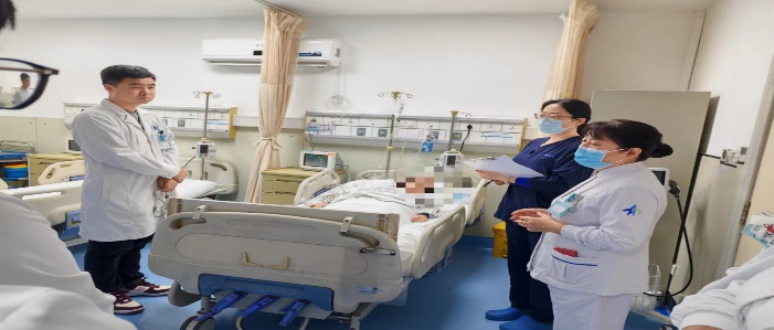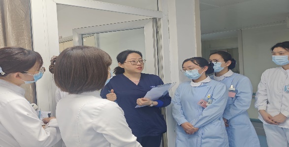 首先,由韩娥娥主管护理师开展肺栓塞应急预案演练。现场随机指点护士,对所给案例进行情景演练。案例:患者,男,60岁,右肺癌,于2024年2月29日在全麻下行右肺上叶切除术,3月4日责任护士巡回病房时,患者突然出现呼吸困难、咯血、口唇发绀、大汗淋漓。护士立刻呼叫值班医生及护士长,并推急救车到患者床旁,医生查体后初步判断为肺栓塞,并打电话急请麻醉科和中心ICU会诊。张晗护理师遵医嘱给予患者吸氧,心电监护,刘晓然主管护理师建立静脉通路。突然患者意识丧失,颈动脉搏动丧失,王倩主管护理师立即开始徒手心肺复苏,樊晓娥护士长现场指挥,几人分工明确,经过一轮抢救,确认患者意识逐渐恢复后,转入ICU进一步治疗。