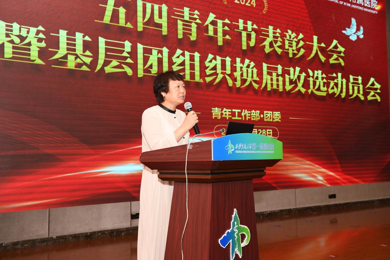 4月28日下午,西安交通大学第一附属医院召开2024年“五四”表彰大会暨基层团组织换届改选工作动员会。陕西省卫健委团委书记毋利宜、学校副校长、一附院院长、党委副书记吕毅、校团委副书记李开贤、我院党委副书记冯广林、副书记兼纪委书记韩菊、副院长佘军军、院长助理马欣出席会议。各科室党支部书记和党政职能部门负责人代表、院团委委员、团支部书记以及团员青年代表参加会议。会议由韩菊副书记主持。
