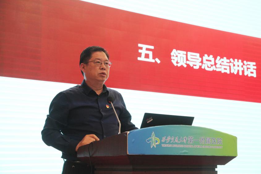 在总结讲话中,马辛格书记强调学习贯彻落实第四次党代会精神,凝心聚力推进医院事业高质量发展是医院当前各项工作的主线,他围绕“学科发展、党建融合、监督保障”三个方面 进一步明确目标要求和路径举措。一是学科规划要锚定医院长远目标,强化“有组织”发展。他指出学科发展规划要与医院整体规划深度融合,聚焦队伍建设 、创新发展 、人才培养、医疗服务 “ 四大维度 ” 推进学科建设,党支部书记要全程参与、深入掌握学科情况,以共同目标凝聚人心,引导学科骨干、专家教授形成发展共识。二是坚持以高质量党建引领业务发展 ,破解基层建设痛点 。马书记强调要直面现存问题 ,扎实推进基层党组织 “三项工程” ,聚焦学科 发展 实际,创新党建工作平台和载体,提升党建对业务的支撑力 ,全面发挥好支部和党员在 改革发展中的“双两作用 ”。三 是完善 监督保障体系,护航医院健康发展 。他表示要 正视监督短板 ,进一步 强化 党委主体责任和纪委监督责任 ,完善“党委 - 纪委 -支部纪检委员 - 党员民主监督”全链条体系 , 实现主体责任、监督责任、“一岗双责”贯通联动,护航医院事业高质量发展。