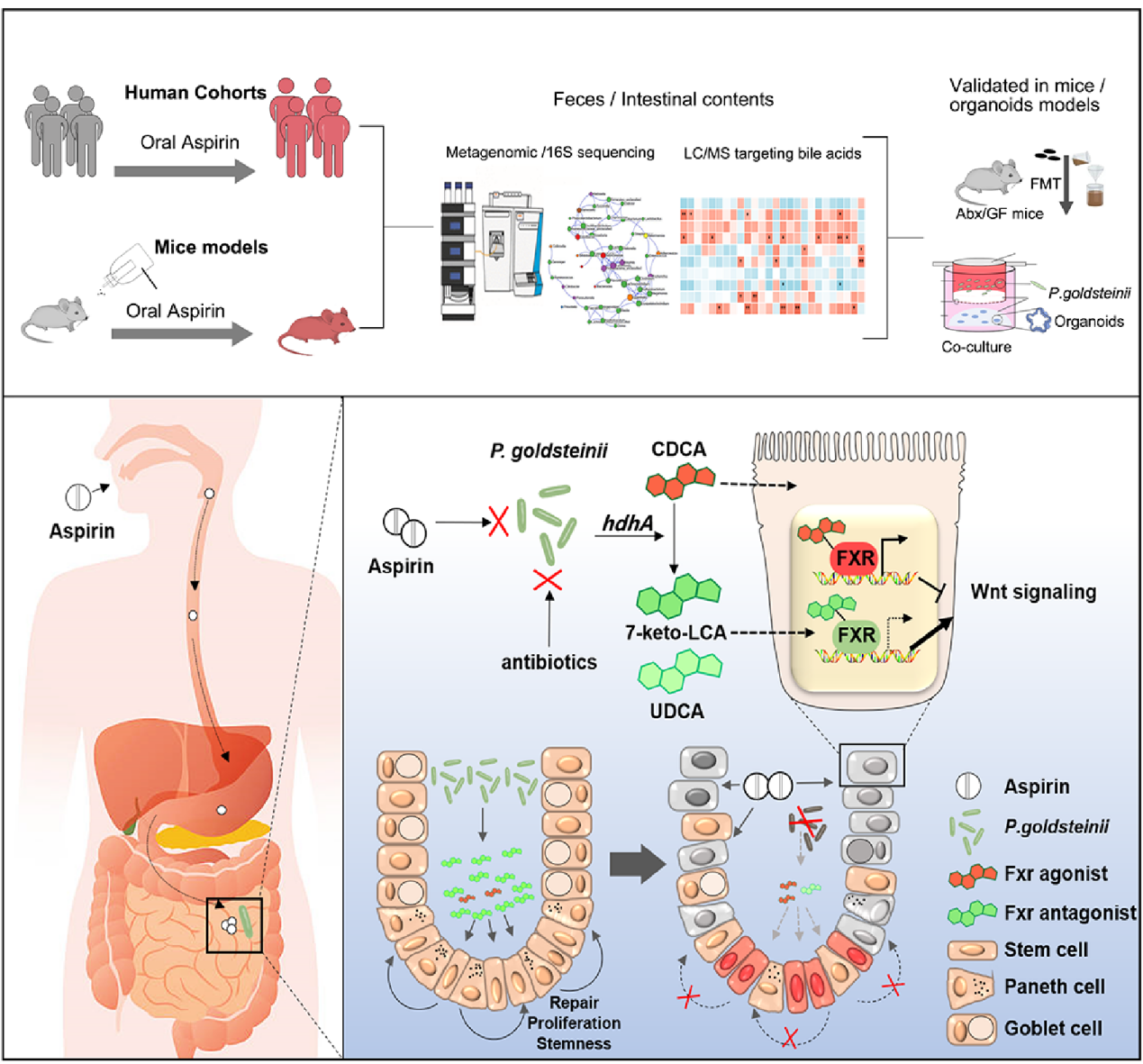 本研究由西安交通大学第一附属医院袁祖贻教授、吴岳教授以及美国国立医学院Frank J Gonzalez合作完成。团队通过整合分析临床队列多组学与动物实验结果,首次系统揭示了 “肠道微生物-胆汁酸轴”在阿司匹林相关肠损伤中的关键保护作用。研究团队鉴定出一种受阿司匹林显著抑制的肠道共生菌——戈氏副拟杆菌(Parabacteroides goldsteinii),及其代谢产物 7-酮石胆酸(7-keto-LCA)。后者在维持肠道稳态中发挥重要作用。实验表明,补充戈氏副拟杆菌能显著减轻阿司匹林引起的小鼠肠道屏障损伤。进一步机制研究揭示,7-keto-LCA作为 法尼醇X受体(FXR)的拮抗剂,通过抑制FXR信号通路,激活Wnt信号,进而促进肠道干细胞的自我更新与上皮修复。该研究为阿司匹林相关肠病的防治提供了新的微生物—代谢干预思路:通过补充特定的益生菌(如戈氏副拟杆菌)或外源性胆汁酸代谢物,有望恢复肠道微生态平衡,减轻药物性肠损伤。