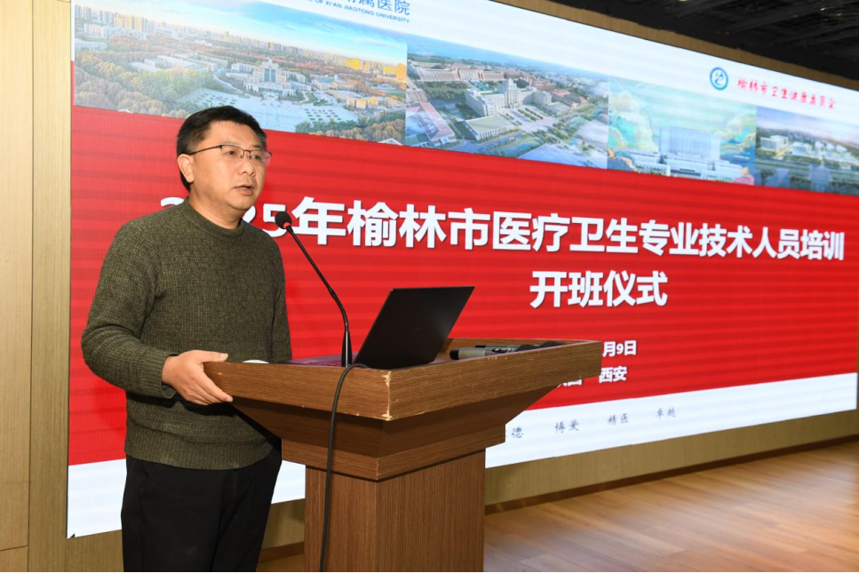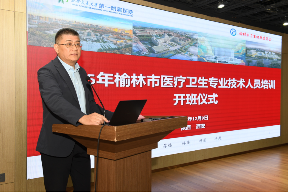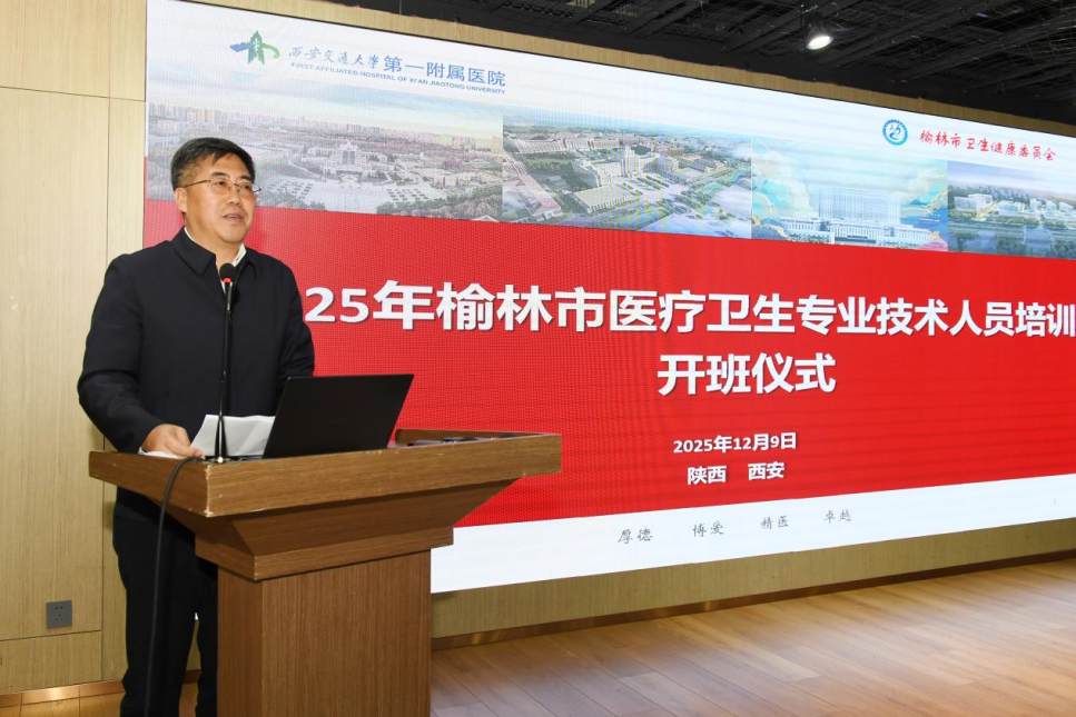 2025年12月9日上午,榆林市医疗卫生专业技术人员培训开班仪式在西安交通大学第一附属医院隆重举行。榆林市卫生健康委员会党组书记、主任张军,西安交通大学第一附属医院副院长韩建峰、院长助理王铮,医务部副部长叶峰、护理部主任李洁琼,党委院长办公室主任葛冠群、医学影像副主任金晨望、医务部质控办副主任梁鹏、医政办副主任胡婷婷以及培训项目负责人、师资代表及全体学员出席仪式。会议由榆林市卫健委党组成员万正平主持。