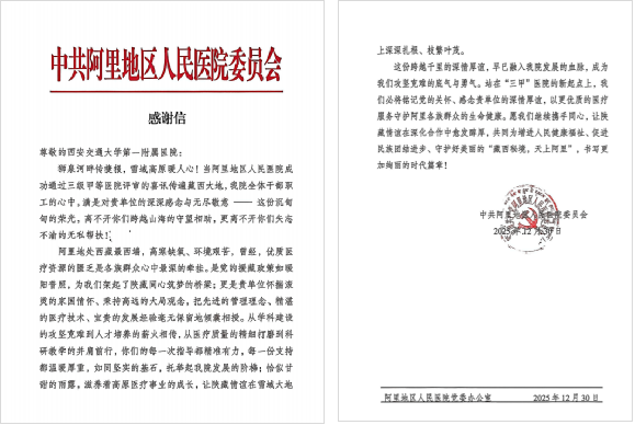 五位“组团式”援阿里地区人民医院专家克服缺氧高原反应等困难,密切配合当地政府、卫健委以及阿里地区人民医院顺利通过三级甲等综合医院评审,标志着阿里地区从此告别全国最后一个没有三甲医院的地级市的历史,当地医疗卫生事业翻开了崭新的篇章!为此,阿里地区人民医院特向我院发来感谢信,对我院长期以来的支持以及援藏专家表示诚挚的谢意。