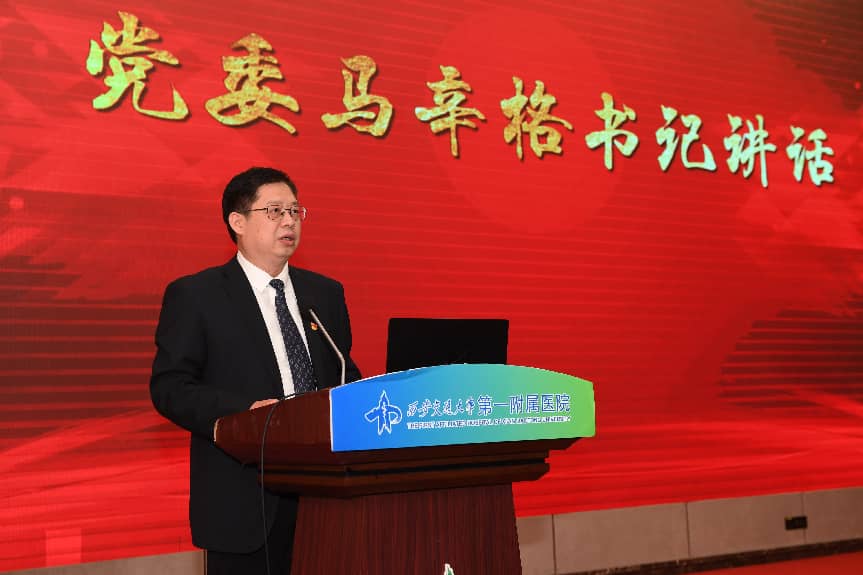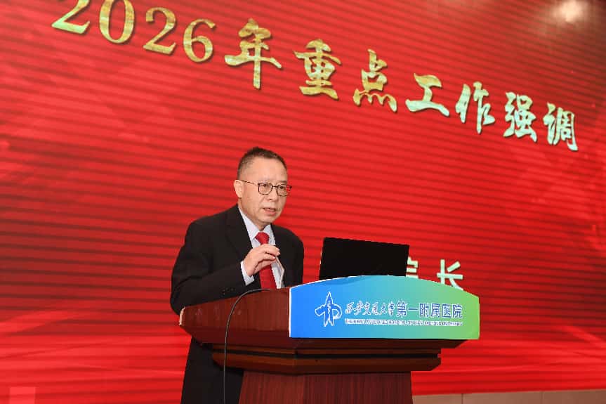 西安交通大学医学部常务副主任雷利利代表医学部,向全院干部职工及家属致以诚挚的感谢和美好的新春祝福。他指出,交大一附院作为国家医学中心建设的核心攻坚力量,在2025这一承前启后的关键之年交出了一份厚重扎实的奋斗答卷。全院上下凝心聚力、实干笃行,在党建引领、医疗技术创新、科研教学、人才队伍建设、战略布局拓展及服务民生改善等方面成效显著,多项核心诊疗技术跻身国内外先进行列,优质医疗资源辐射范围持续扩大,以医者担当践行初心使命,为学校赢得了良好声誉。他强调,2026年恰逢学校建校130周年、西迁70周年及医院建院70周年,也是国家医学中心建设的开局之年,学校将持续加大对交大一附院的支持力度,希望全体同仁以先进为标杆、以榜样为力量,勇闯发展难关、精进医疗技艺、笃行实干担当,在创建国家医学中心、推动医学事业高质量发展的道路上再谱新篇,为学校建设世界一流大学、为健康中国建设贡献更大医疗力量。