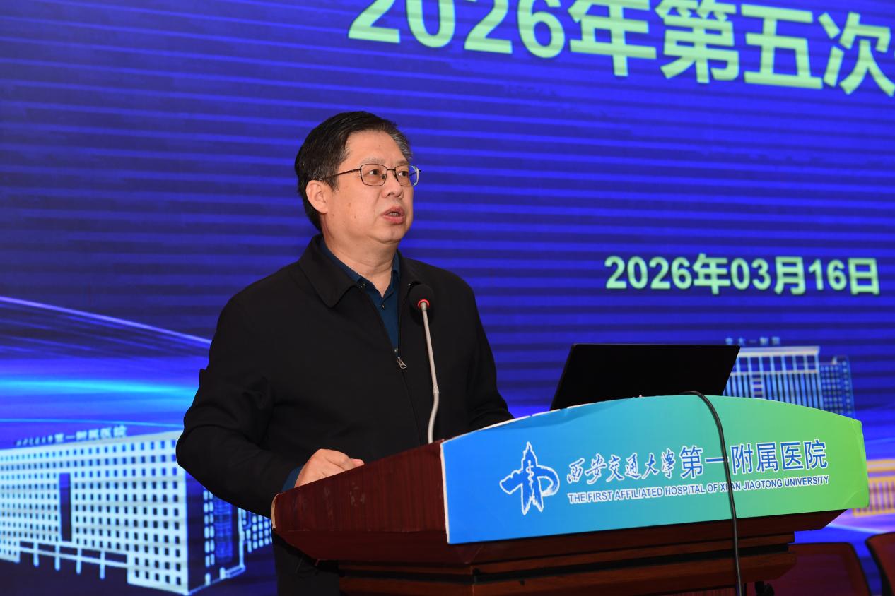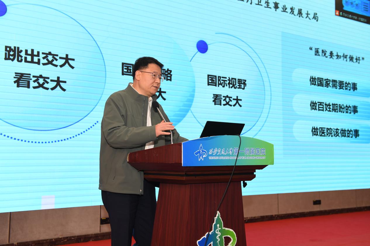 佘军军副院长以《探索区中建设模式 助力国家医学中心》为题,紧扣榆林医院作为国家区域医疗中心的战略定位,全面回顾了该医院基本情况与飞速发展历程,分别从优化人才配置、提升医疗服务、强化科研创新、深化人才培养、落实基层帮扶及精细化运营管理等方面系统梳理了汇聚力量、加强内涵建设、争创国家示范的“国中/区中贯通发展”思路,并殷切希望全院干部持续提升战略执行力与规划落实力,以攻坚克难的勇气破除发展壁垒,以精益求精的匠心雕琢建设内涵,凝聚合力共同推动国家区域医疗中心高质量发展。