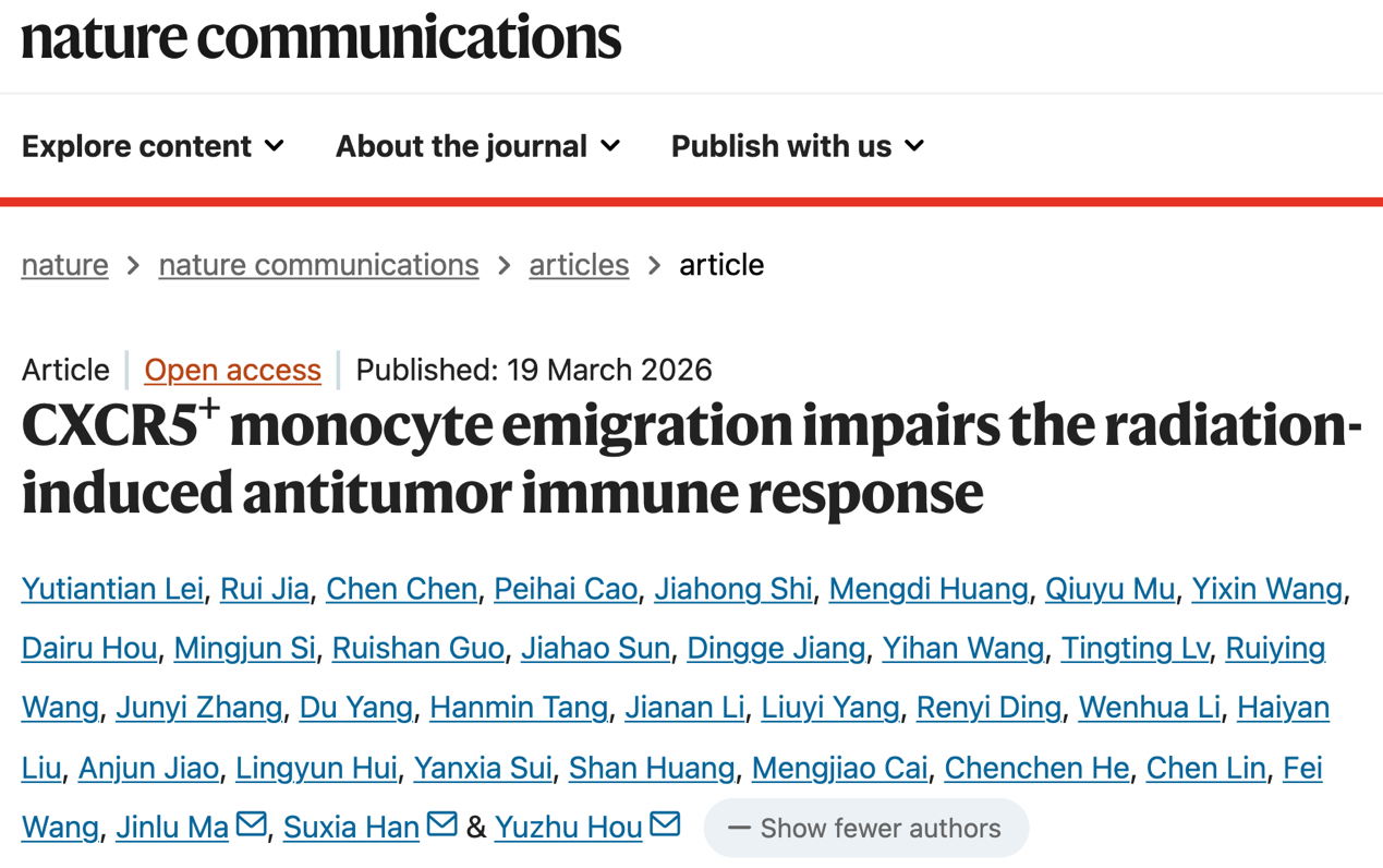 2026年3月19日,我院肿瘤放疗科韩苏夏/马瑾璐团队及基础医学院侯玉柱团队完成重要研究成果《CXCR5+ monocyte emigration impairs the radiation-induced antitumor immune response》(CXCR5+单核细胞向外迁移抑制放射治疗介导的抗肿瘤免疫应答),在《Nature Communications》期刊发表。该研究首次发现CXCR5+单核细胞在放射抵抗中的重要作用,CXCR5+单核细胞的产生、迁移、功能,以及分化几个方面阐明了其抑制放射治疗介导的抗肿瘤免疫反应的机制,为放射-免疫联合治疗提供了理论依据,为肿瘤的综合治疗提供了新的治疗策略。
