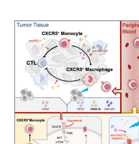 研究团队检测患者放射治疗前后肿瘤组织及外周血的单核细胞,结果表明受照肿瘤中存在CXCR5+单核细胞浸润,且放射治疗后进展的患者外周血单核细胞比例显著升高。在放射治疗时联合阻断CXCR5-CXCL13轴、抑制PD-1/PD-L1信号,中和GM-CSF,最终有效提升放射治疗的效果。阐明其机制为完善综合治疗策略,改善肿瘤患者预后提供了新的方向。