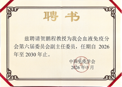 2026年3月27日,中国免疫学会血液免疫分会第六届委员会全体会议在北京顺利召开,本届全委会共85位委员,全体委员投票,分别选出第六届委员会常委、副主委和侯任主委,西安交通大学第一附属医院贺鹏程教授当选为分会副主委。