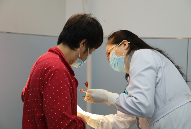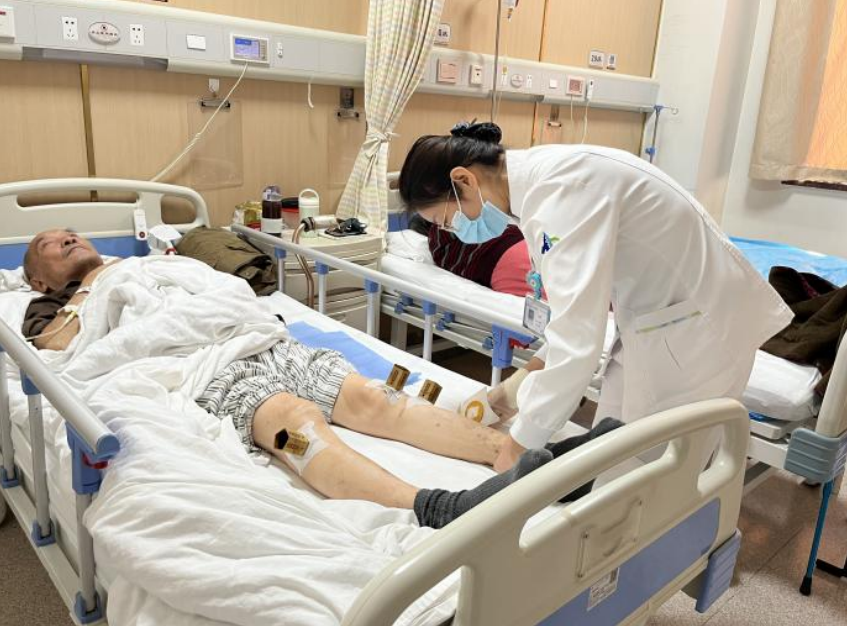 “阿姨今天感觉怎么样?放轻松,咱们给腿上建一排‘大雁塔’。”小小的艾灸罐子古色古香,护士们暖心的玩笑让病人的心情也变得愉快。