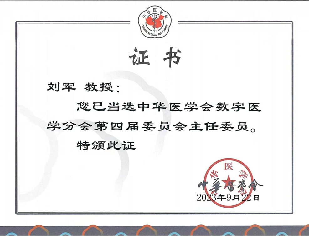 刘军教授当选中华医学会数字医学分会第四届委员会主任委员的证书