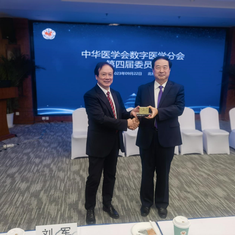 前任主任委员方驰华教授向主任委员刘军教授交接中华医学会数字医学分会印章