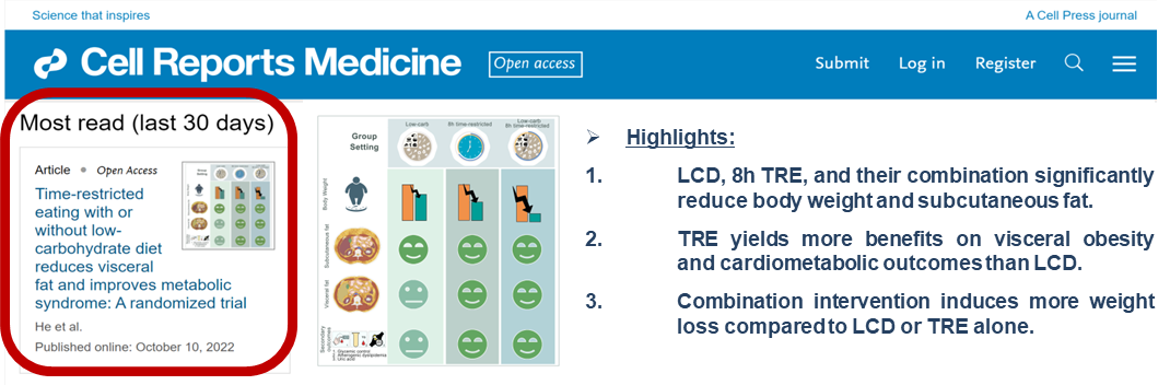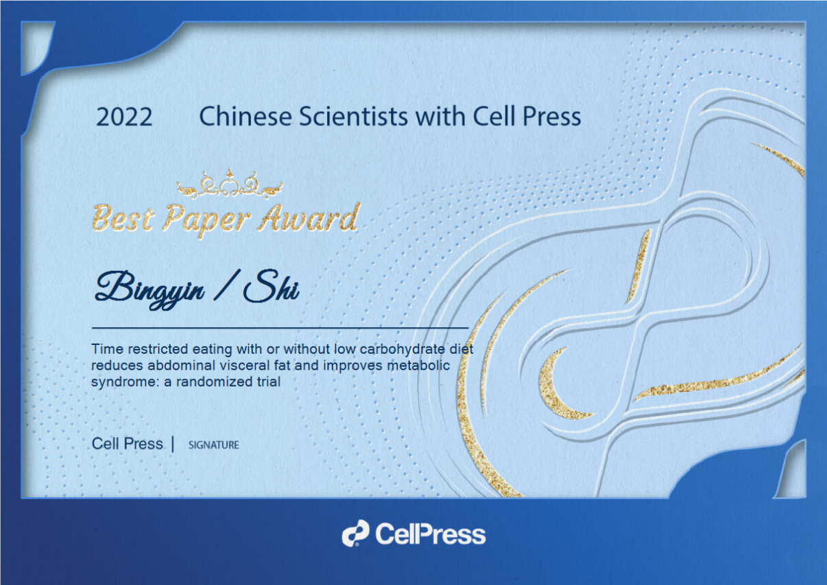 Cell Press(细胞出版社)的2022年度中国年度论文评奖于2023年11月23日圆满落下帷幕。在严谨的期刊编辑提名、第三方专家委员会的独立评审下,综合论文下载量、引用量和领域内突破性等标准后,细胞出版社从2022年发表的1932篇中国机构研究论文(第一完成单位)中遴选出5篇 “细胞出版社2022中国年度论文(医学领域)”。我院内分泌代谢科施秉银教授团队发表在 Cell Reports medicine杂志上聚焦代谢综合征领域的原创性研究成果“Time restricted eating with or without low carbohydrate diet reduces abdominal visceral fat and improves metabolic syndrome: a randomized trial”荣获该奖项,这也代表了施教授团队在糖尿病及代谢性疾病领域的相关研究处于世界一流全国领先水平。
